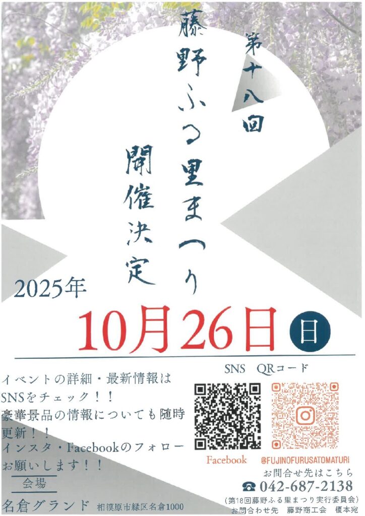 藤野の物産やステージでの演目披露など、藤野の魅力がいっぱいのおまつりです。 開催場所名倉グラウンド(相模原市緑区名倉1000) 詳細は、公式SNSをご確認ください。 f…