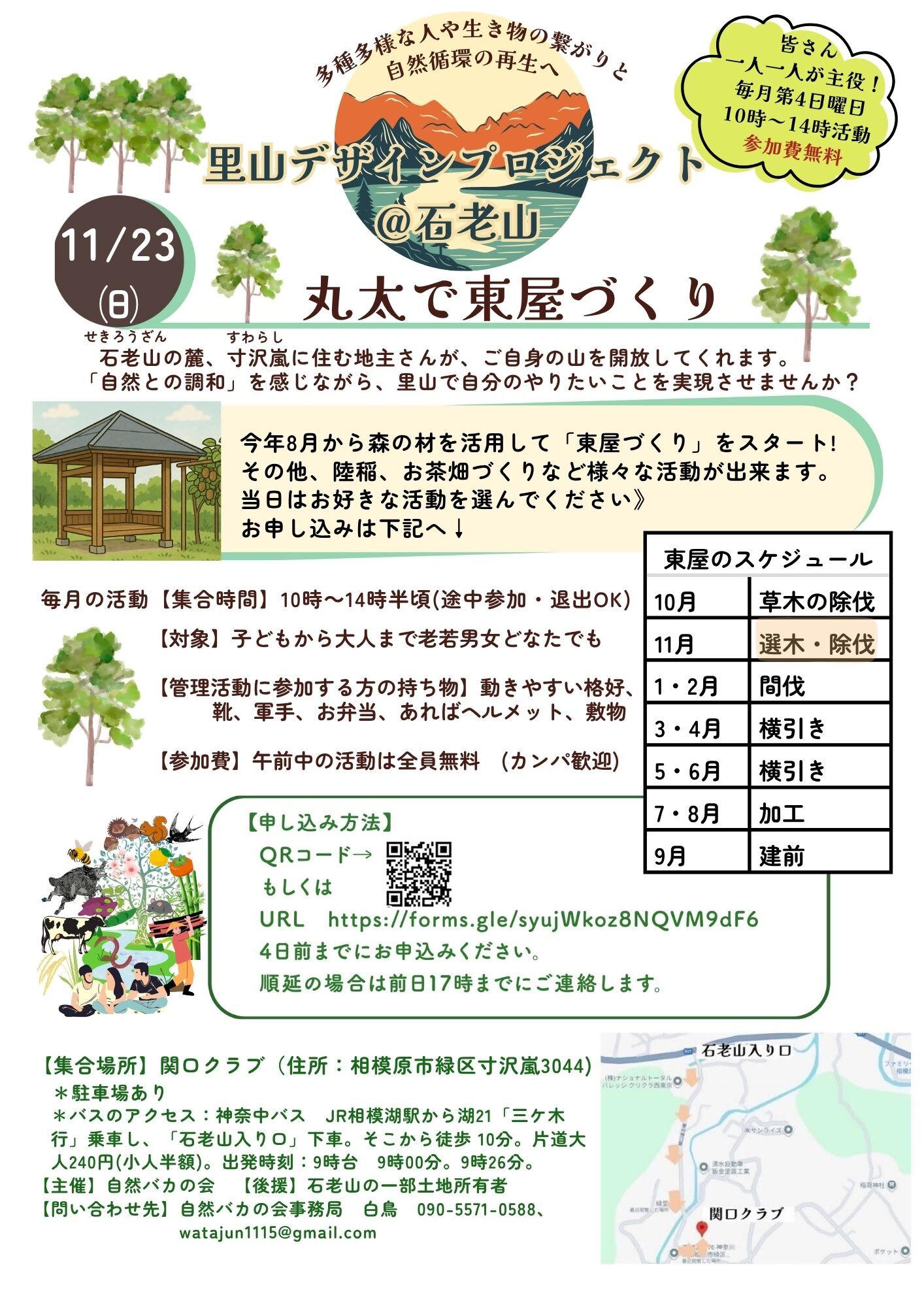 ≪現在開催中!≫【11月23日(日)開催】里山デザインプロジェクト@石老山『東屋づくり』が開催されます!