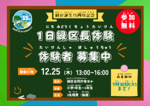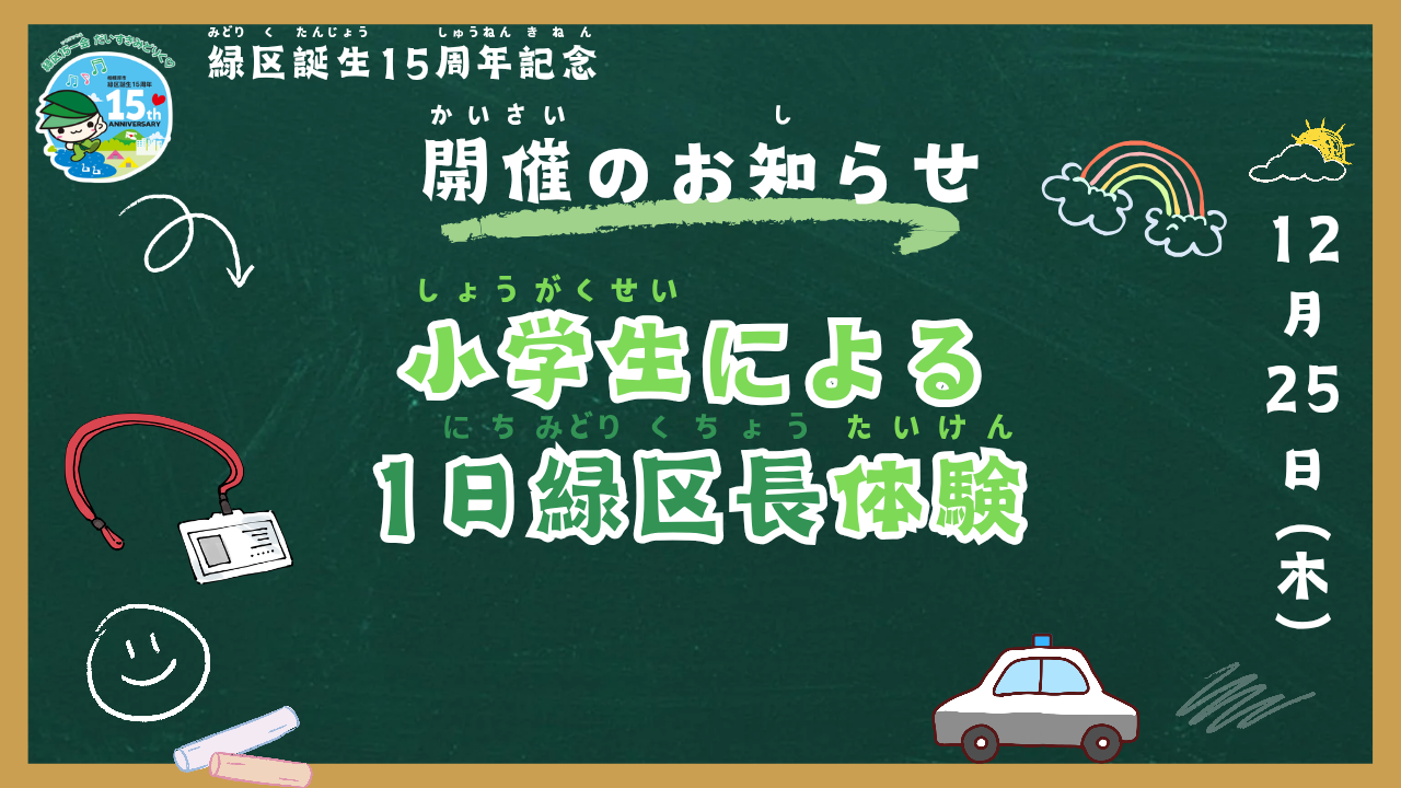 緑区誕生15周年を記念して、緑区への愛着を醸成するため、区内在住の小学生が「1日緑区長」に就任し、緑区長とのお話し会や、緑区のPRグッズのアイディア検討会議などを行います。