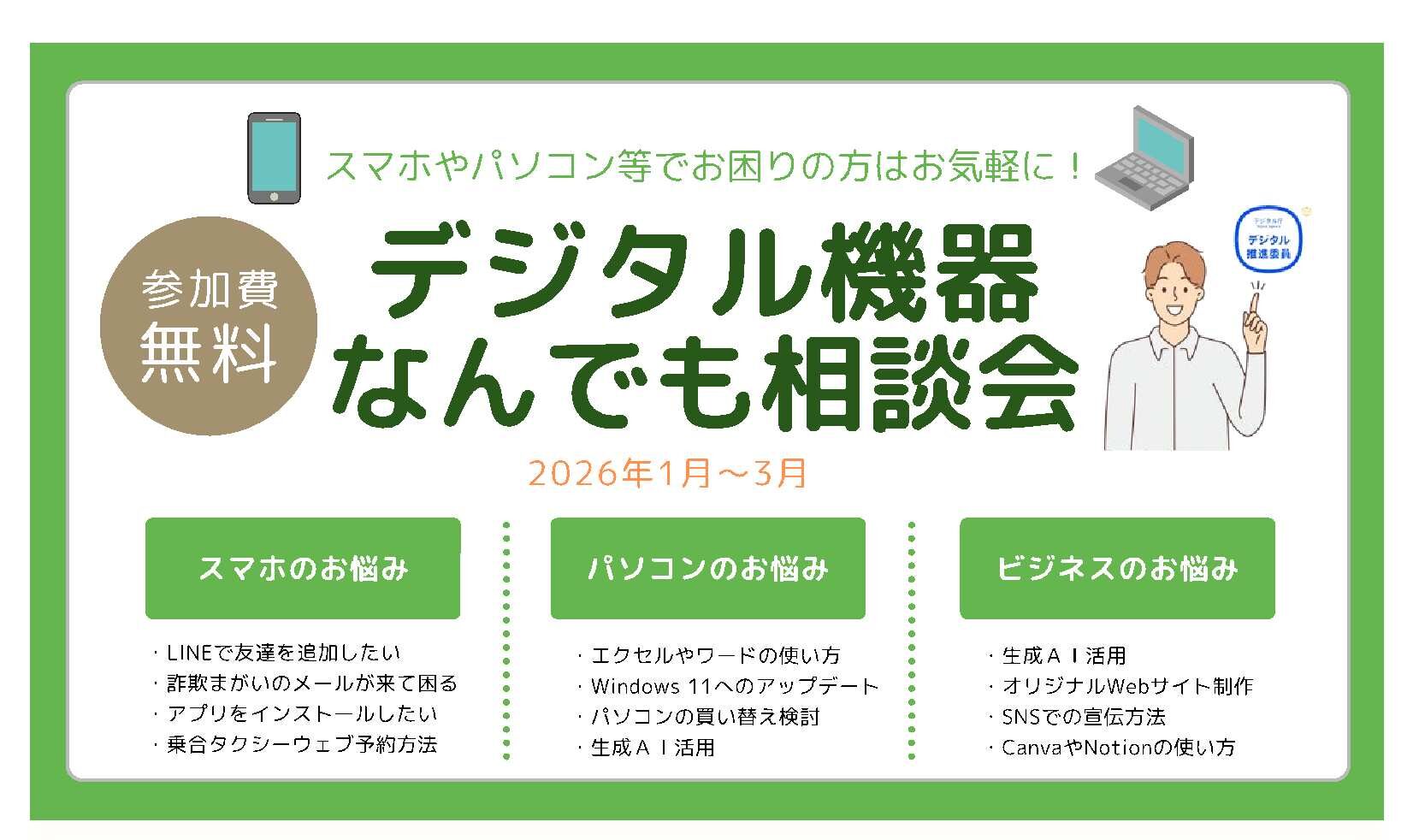 【2026年1月~3月まで開催】デジタル機器なんでも相談会が開催されます!