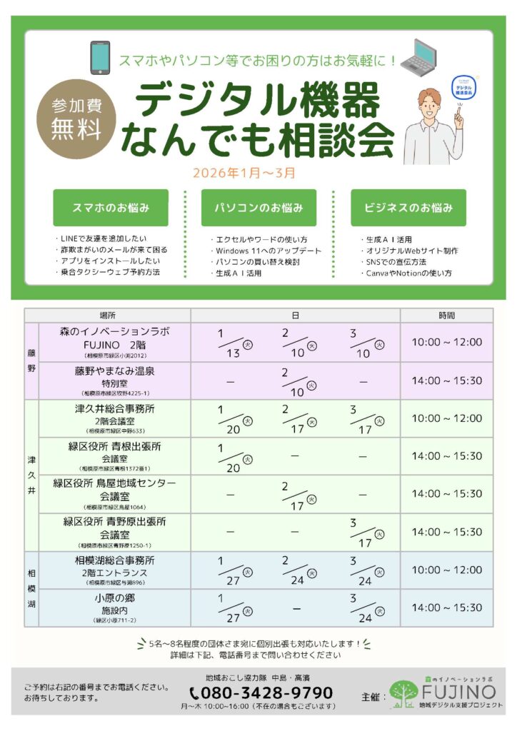 2024年1月より「デジタル機器なんでも相談会」を開始し、相模原市の中山間地域(津久井・相模湖・藤野地区)の各拠点で定期的に開催してきました。