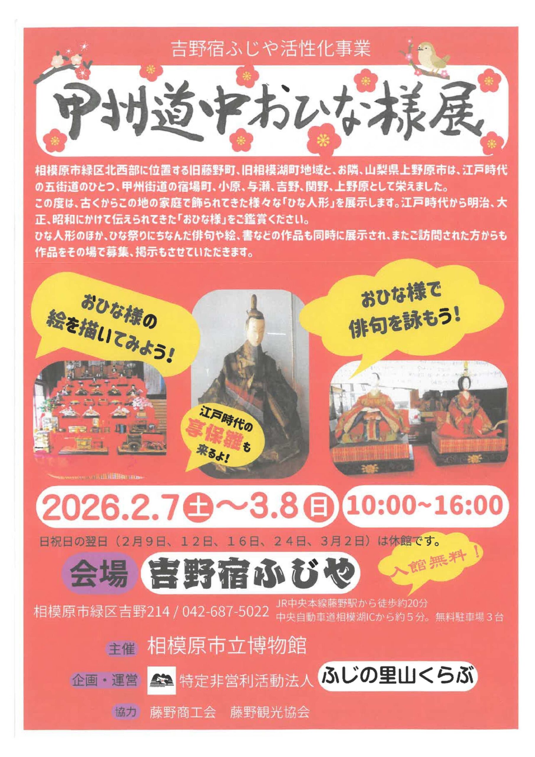 藤野、相模湖、上野原市に代々伝えられてきたさまざまな『おひな様』を集めて紹介します。100年以上前から伝わる貴重なひな人形も鑑賞することができます。 開催場所吉…