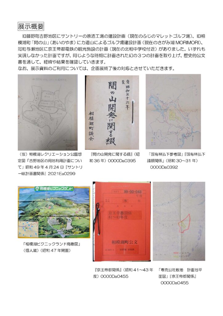 相模湖・藤野地域で計画された開発事業のうち、幻に終わった開発計画や引き継がれている観光開発などに関わる公文書を展示します📖