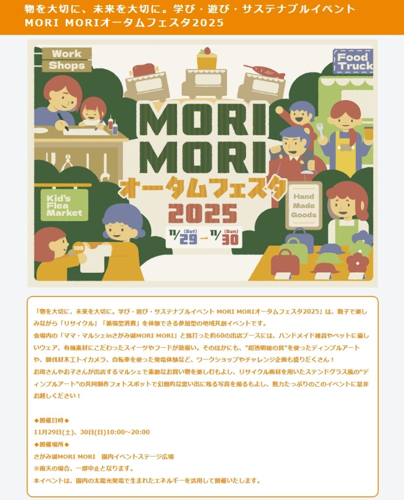 さがみ湖MORIMORIで「物を大切に、未来を大切に。学び・遊び・サステナブルイベント MORI MORIオータムフェスタ2025」が開催されます!親子で楽しみ […](続きを読む)